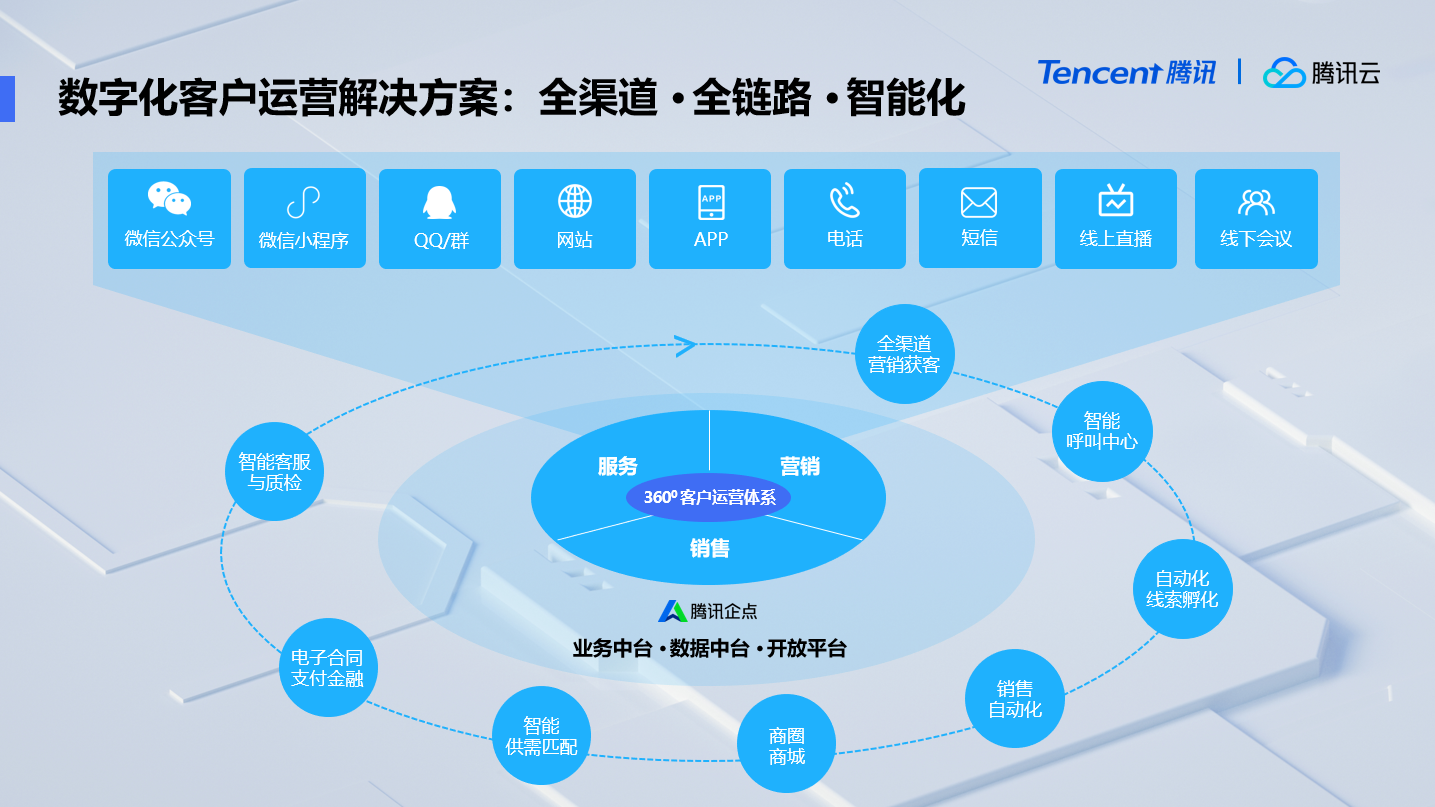 全渠道:企业与客户建立全面数字化连接,无论是官网、APP、微信公众号、小程序、QQ、群、电话、短信、直播、线上线下会议还是会展,能够跨渠道识别客户,理解客户需求和痛点,沉淀为数字资产。