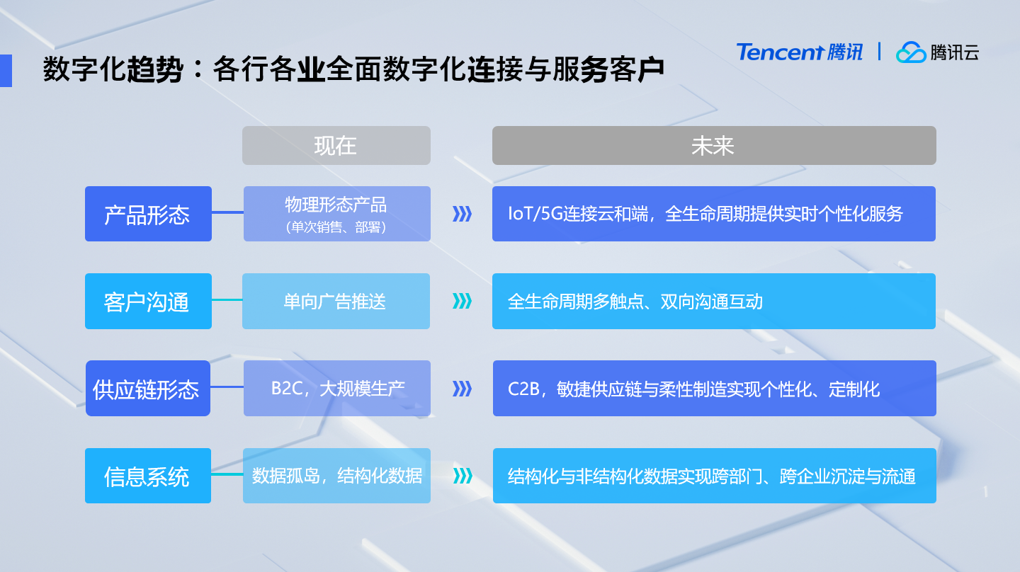 首先是产品形态的变化。现在的产品很多还是一次性购买、部署和使用,未来的产品可以通过物联网、5G连接云和端,让企业能够在产品的全生命周期提供实时、个性化有价值的服务。比如说,ToB的机械设备类产品可以提供预测性维护,参数调优来最大化产能。ToC产品可以通过互联网提供更为丰富的数字化内容,让客户得到更好的使用和服务体验。