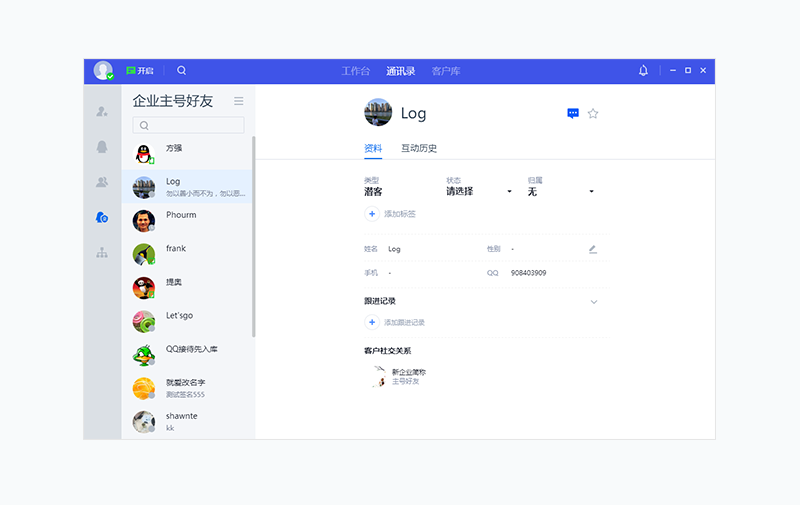 员工添加客户为主号好友,客户同意后,在自动入库时将自动归属给最近一个发送好友请求的员工;当客户主动添加企业主号为好友时,将不会自动设置归属。