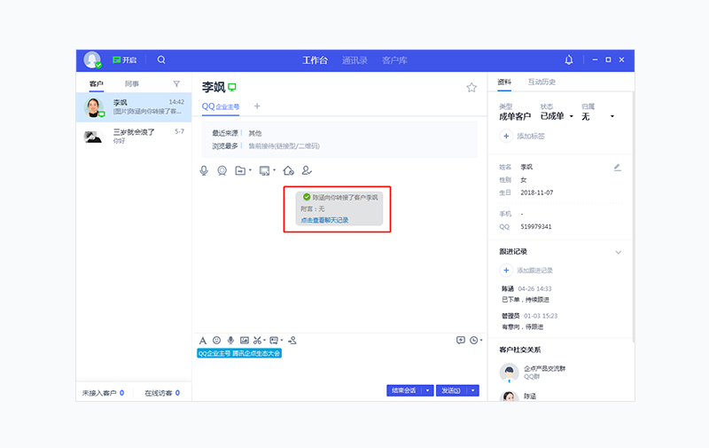 QQ企业主号对外时,当客户转接给新的员工接待,员工在接入该客户时,可以点击查看之前的聊天记录。