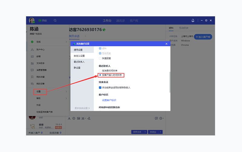 「工作台」左侧联系人列表支持固定排序,且支持拖拽调整顺序。其中置顶和非置顶的联系人互相独立,置顶的联系人无论怎么拖拽都依旧在非置顶联系人的上方。员工可以打开主菜单的「设置」-「系统设置」-「自定义设置」页面,勾选“按客户接入时间排序”,选定后,列表顺序保持相对固定不变,且在该排序模式下可以通过鼠标拖拽联系人调整顺序。