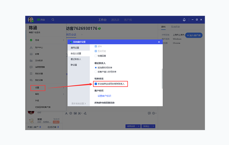 在工作台主菜单-「设置」-「系统设置」页面,勾选“手动结束会话同时移除联系人”后,当员工手动点击“结束会话”,则该会话窗口将被关闭,左侧联系人列表中该联系人将被移除。