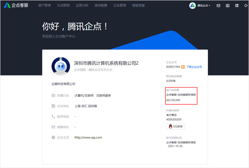 在账户中心首页新增客户库容量显示,包括客户库总容量及已使用容量信息,方便企业及时掌握客户库容量详情,并根据企业业务情况做及时的调整。
