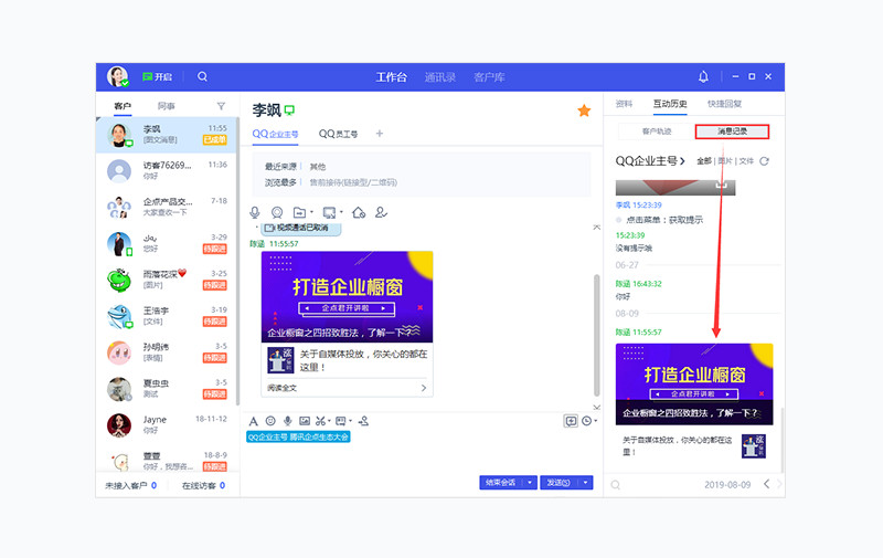 「工作台」右侧「互动历史」页面,客户轨迹及消息记录中支持完整展示图文素材消息,点击后通过浏览器打开对应页面。
