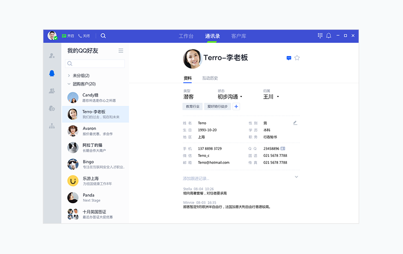 二、工作台相关 :1.结束会话移除最近联系人 | 2.联系人列表固定排序 | 3.“我的QQ好友”支持搜索 | 4.增加“企业主号好友”列表 | 5.消息记录支持按日期筛选 | 6.客户轨迹及聊天记录展示图文消息 | 7.主号转接提醒查看历史记录