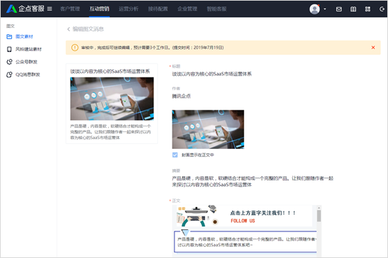 在账户中心-「互动营销」-「图文素材」页面中,新建图文素材需进行审核。审核通过的文章可正常使用,审核中的文章将无法编辑。