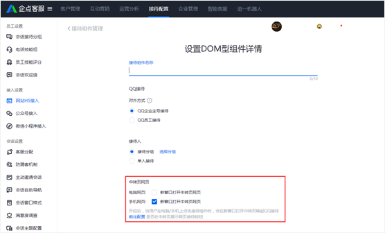在账户中心-「接待配置」-「网站H5接入」页面中,选择DOM型-QQ接待组件时,支持选择是否开启中转页。开启后,当用户在电脑/手机上点击接待组件时,会在新窗口中打开中转页唤起QQ接待。