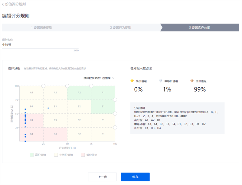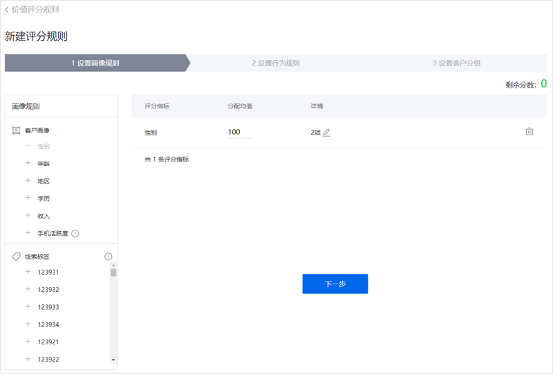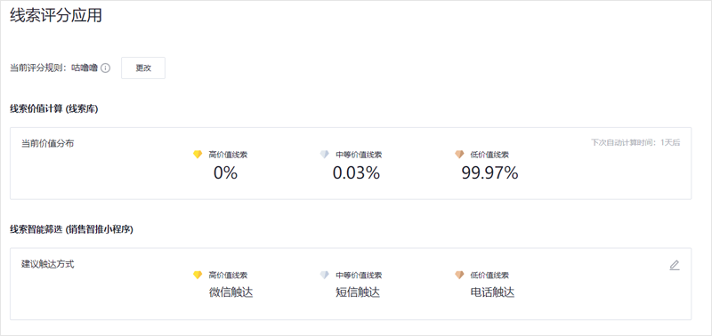 操作:前往账户中心-线索管理-客户评估-价值评分规则页面设置