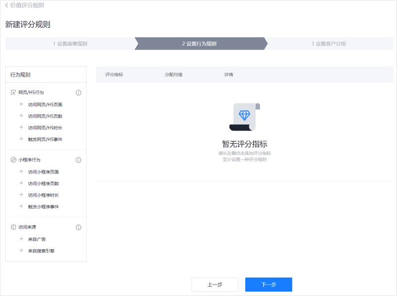 评分规则中新增线索标签和小程序行为,管理者可根据客户画像、线索标签、网页/H5行为、小程序行为、访问来源对已有线索进行价值评分,针对不同场景更准确制定评分指标,使评分结果更贴近自身业务。