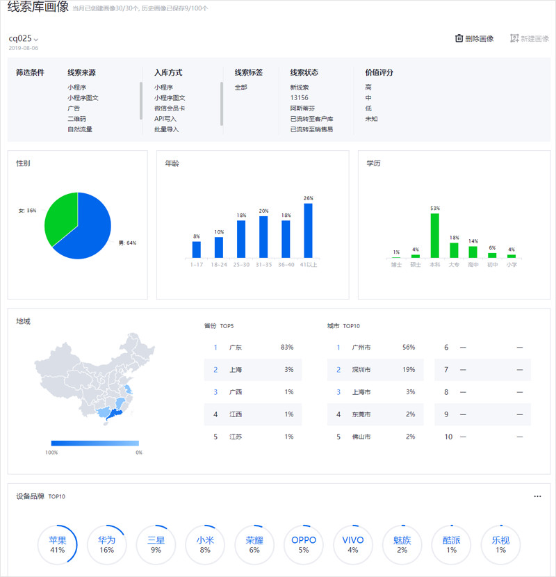 新增线索库画像,结合腾讯的数据能力帮助企业了解线索整体画像分布,包含:性别、年龄、学历、地域、常用设备特征,从而更好地调优营销活动。