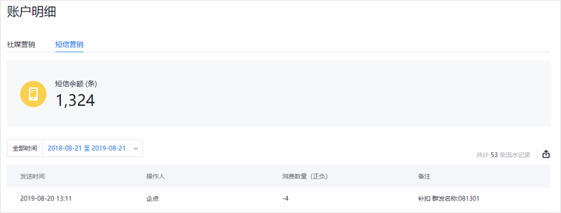 操作:前往账户中心-账户明细-短信营销页面查看