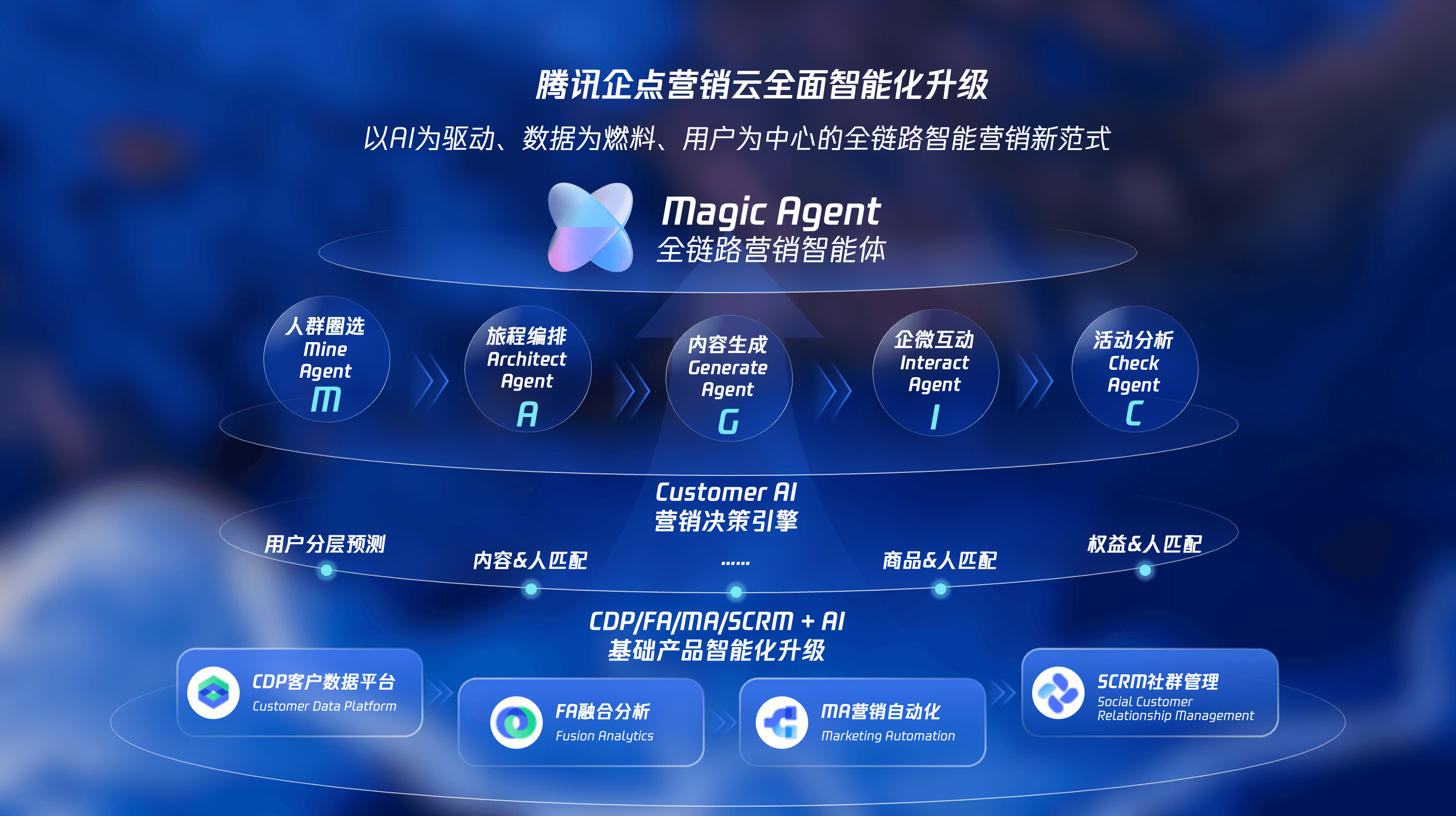 在腾讯企点CDP之外,腾讯企点营销云全系基础产品如营销自动化(MA)、社交客户关系管理(SCRM)和融合分析(FA)等也已经全面拥抱智能化。今年9月,腾讯企点对外升级发布了“Magic Agent”全链路营销智能体,通过多个Agent构成的智能体系,让营销人员实现“从1人变身1个团队”的飞跃。